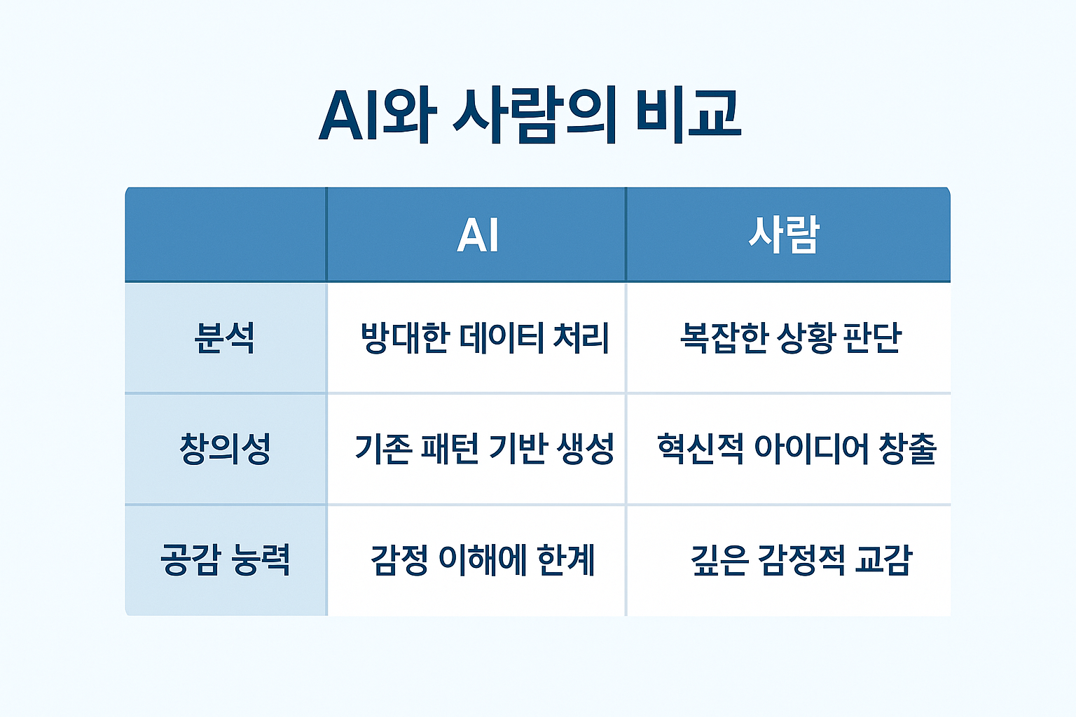 AI는 사람을 완전히 대체하기보다는, 사람이 하기 힘든 반복 작업과 데이터 분석을 대신해 주고 사람은 더 중요한 판단과 관리에 집중하도록 돕는 역할에 가깝습니다.
