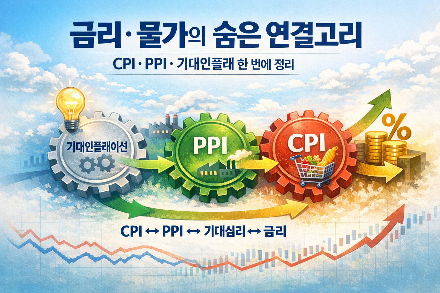CPI는 ‘현재의 물가’, PPI는 ‘공급단 원가’, 기대인플레이션은 ‘미래 심리’입니다. 세 지표는 금리라는 축을 중심으로 맞물려 움직입니다.