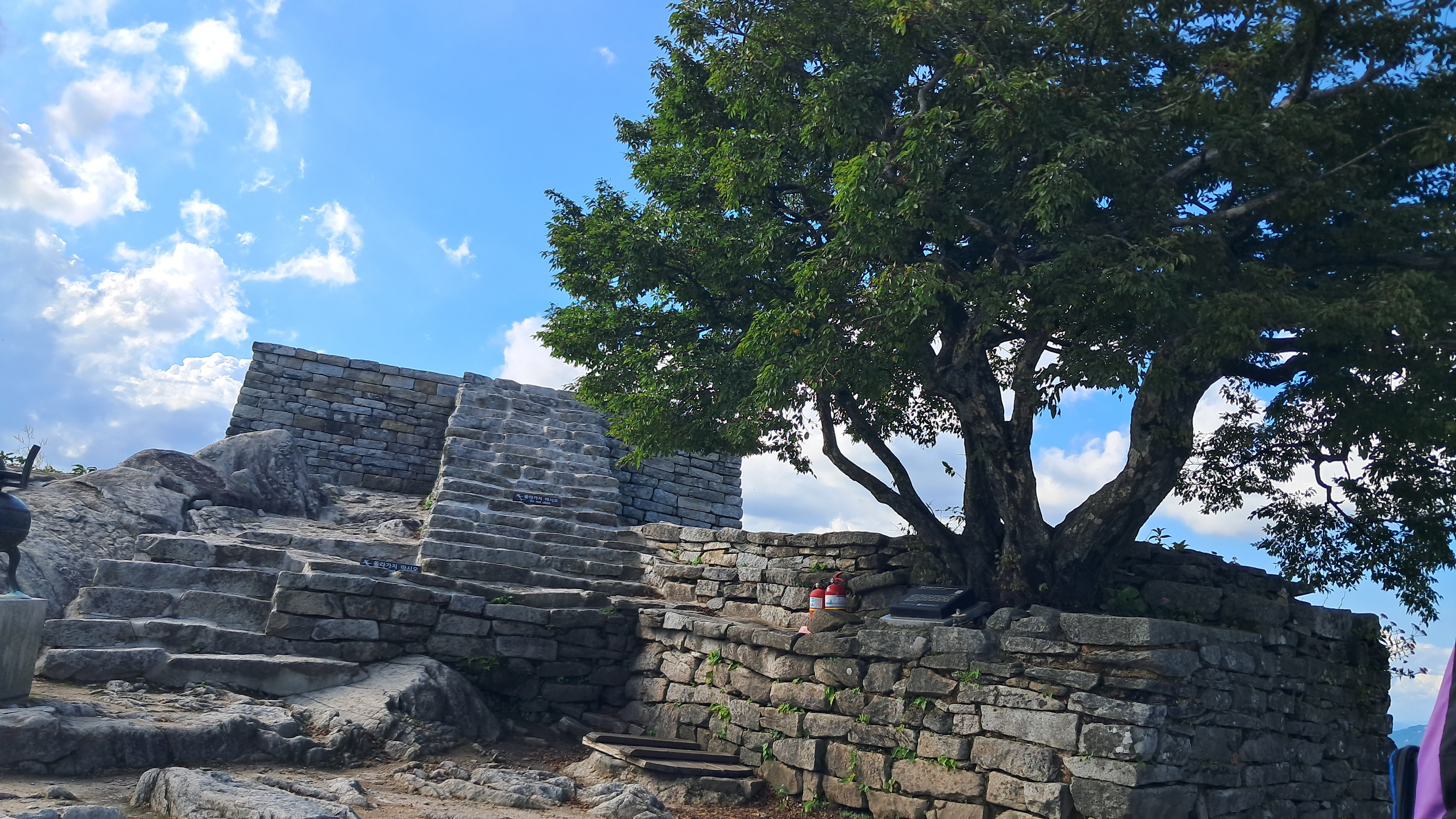 헬기장에서 기념사진을 찍고 바로 앞 참성단에 올랐습니다. 수백 년 된 소사나무(천연기념물)가 지키는 제단은 보호 차원에서 직접 오를 수 없도록 안내되어 있어 주변에서 감상만 했습니다. 영상 통화로 아내에게 풍경을 보여주니 “멋지다, 조심해서 내려와”라는 말이 돌아왔습니다.