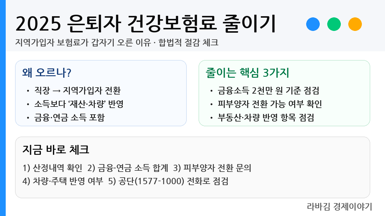 은퇴자 건강보험료는 ‘자동으로’ 줄지 않습니다. 알고 점검한 사람만 줄일 수 있습니다.
